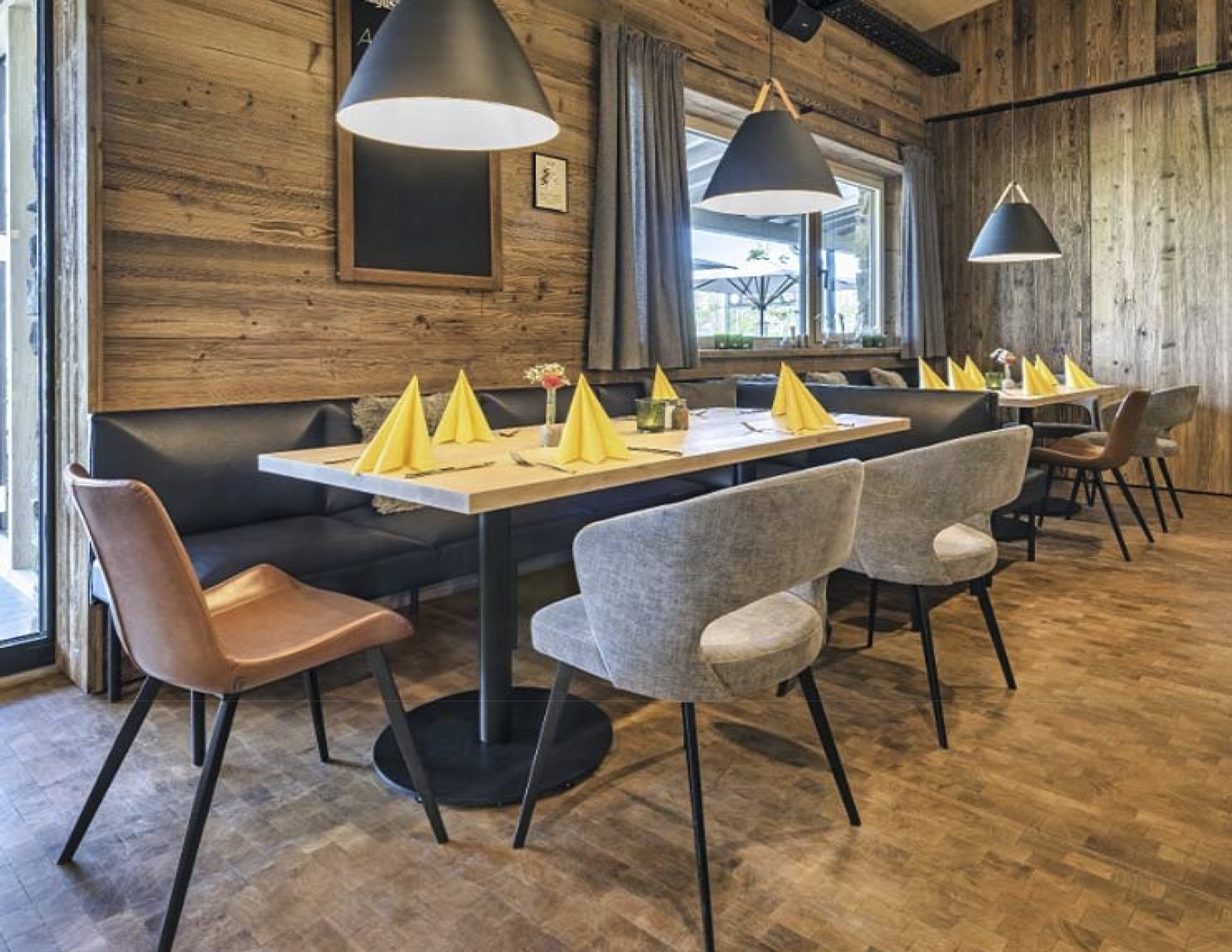 - Das Restaurant kann sowohl für Feste und Feierlichkeiten mit 140 Plätzen genutzt werden und kann für den Alltagsbetrieb mit einer einfachen Schiebetür als Raumteiler verkleinert werden.